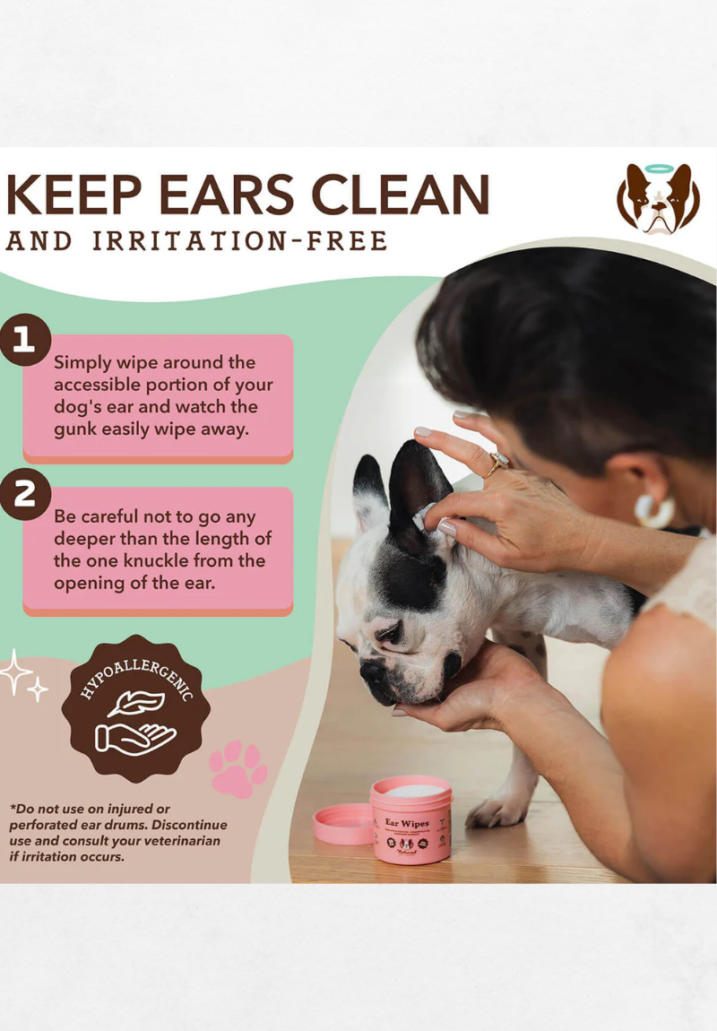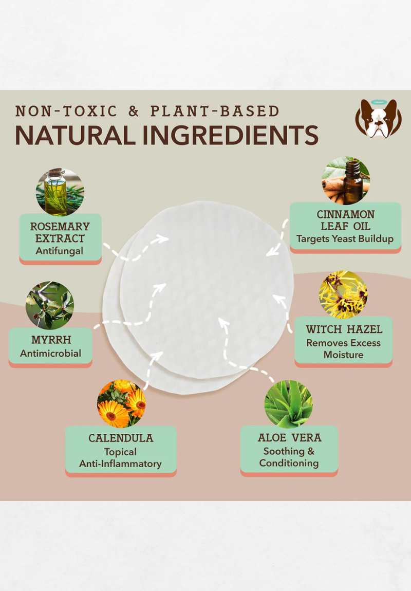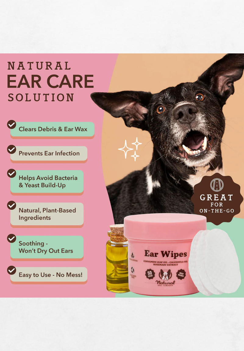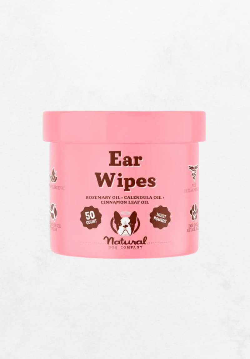 Ove vlažne maramice za uši posebno su stvorene za zdravlje i čistoću psećih ušiju. Natural Dog Company “Ear Wipes” sadrže prirodne sastojke poput ulja od lista cimeta (cinnamon leaf oil), smirnice (myrrh) i ružmarina (rosemary) koji zajedno djeluju protiv gljivica i bakterija te umiruju iritacije uha.